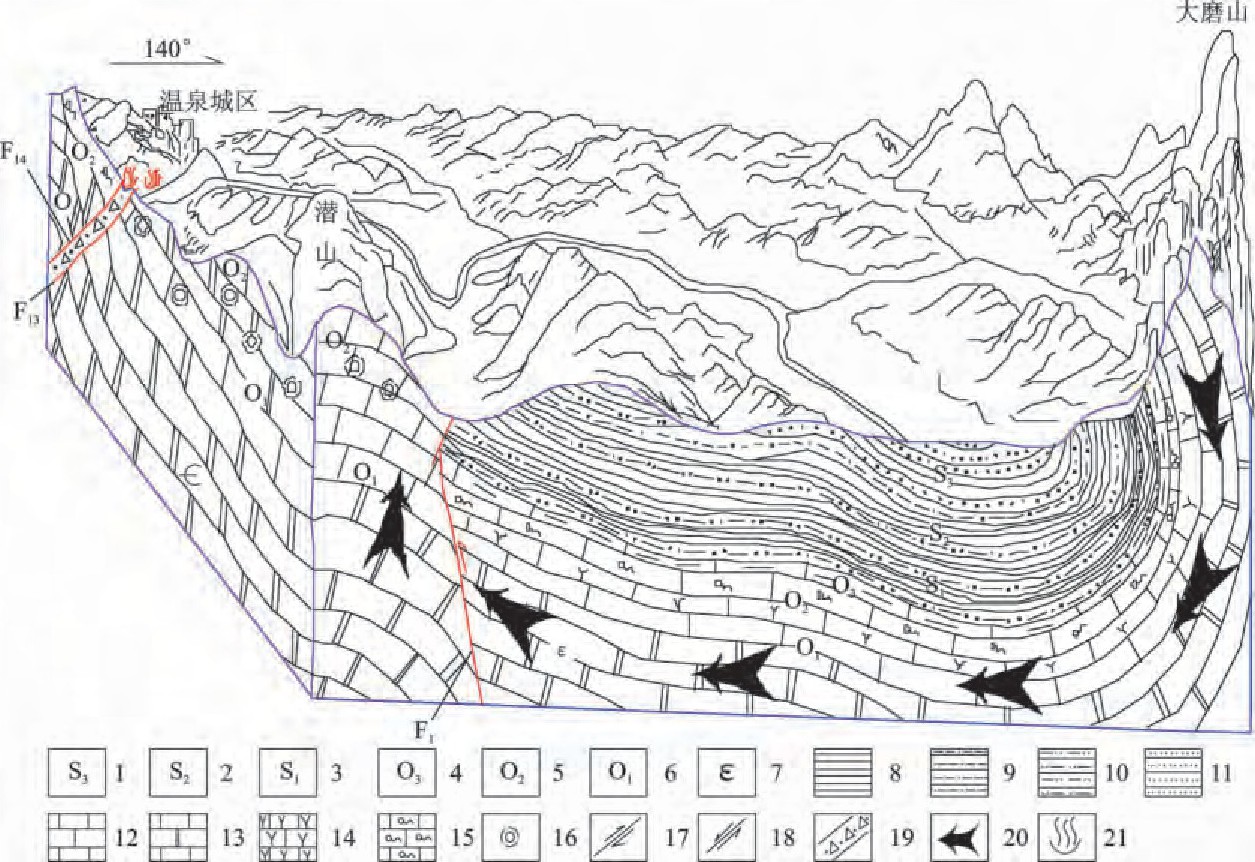 咸寧地質構造位置處于揚子準地臺梁子湖坳陷與咸寧臺褶束的交接部位,從屬于大幕山復式背斜北翼的次級構造—高橋向斜、孫鑒鋪倒轉背斜、賈家山倒轉向斜的西延部分,由一系列的緊密褶皺組成區內的基本構造骨架。新華夏晚期構造體系在潛山一帶表現強烈,其中大義山式斷裂有明顯的反映。這些不同的構造體系互相干擾、復合,不僅控制了區內的巖性組合、地貌、巖溶發育,而且也嚴格控制了地下水的分布及其補給、運移和排泄。潛山背斜是地熱田的主要構造骨架,其特點是呈梳狀,且向南東倒轉,區內溫泉斷裂規模最大,且是經過多次構造變動的復合性斷裂,先期為縱張斷裂且以垂直運動為主,后期表現為逆向復合,并受逆時針的應力作用而顯壓扭性特征,是深切割斷裂,也是控制區內地熱流體分布的主要斷裂。